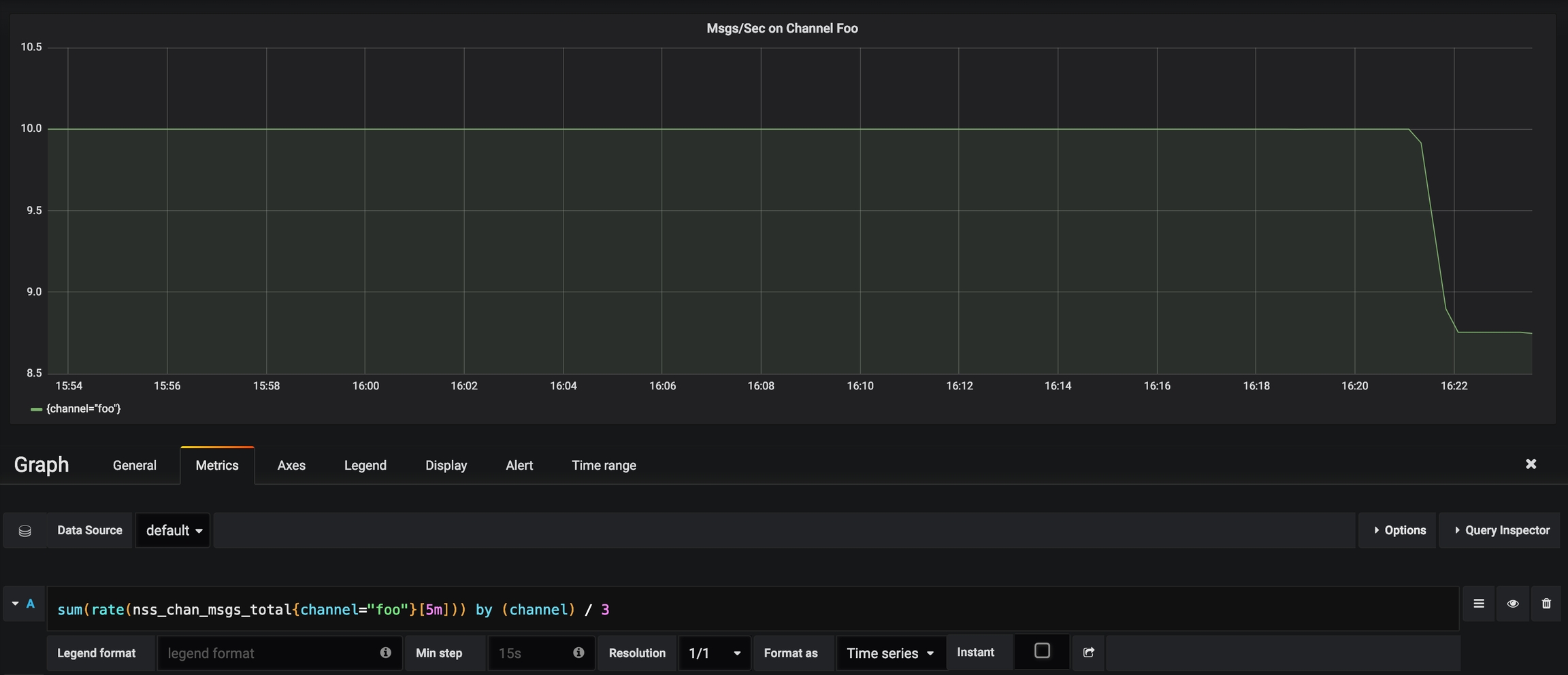 sum(rate(nss_chan_msgs_total{channel="foo"}[5m])) by (channel) / 3